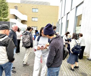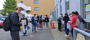 「火事だ!火事だ!」と周りに声を掛け合いながら、皆でかたまって広い場所(学習館駐車場)へ速やかに移動できました。非常食の梅がゆとビスケットが配布され、日本で暮らす外国人にとっても、災害の認識を深める良い機会になりました。